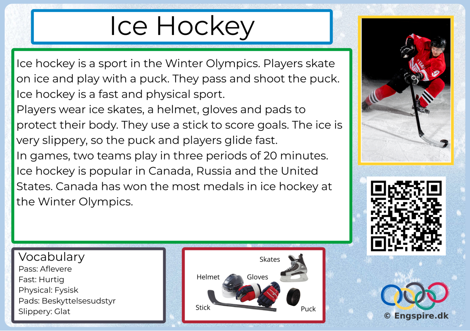 Læsekort om vintersport ved De Olympiske Vinterlege 2026 til engelsk på mellemtrinnet. Hvert kort indeholder en kort tekst, ordforklaringer og en QR kode til video af disciplinen.